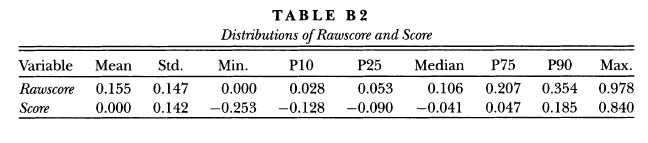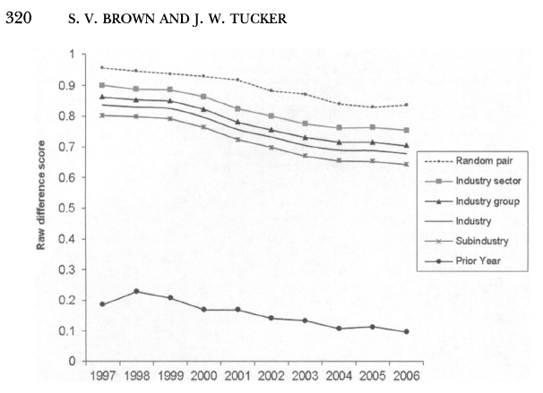 sample period는 1997-2006 의 10년치 EDGAR 10-k filling이다. 사업보고서를 낸 기업들의 'industry'를 GICS code 기준으로 분류하였음. 한 기업과 그 기업의 industry 내의 다른 기업들과의 raw difference score를 평균내서 industry score(개별기업)를 구함. 이제 industry 별로 그 score값들 평균내면 given year의 industry score이다.