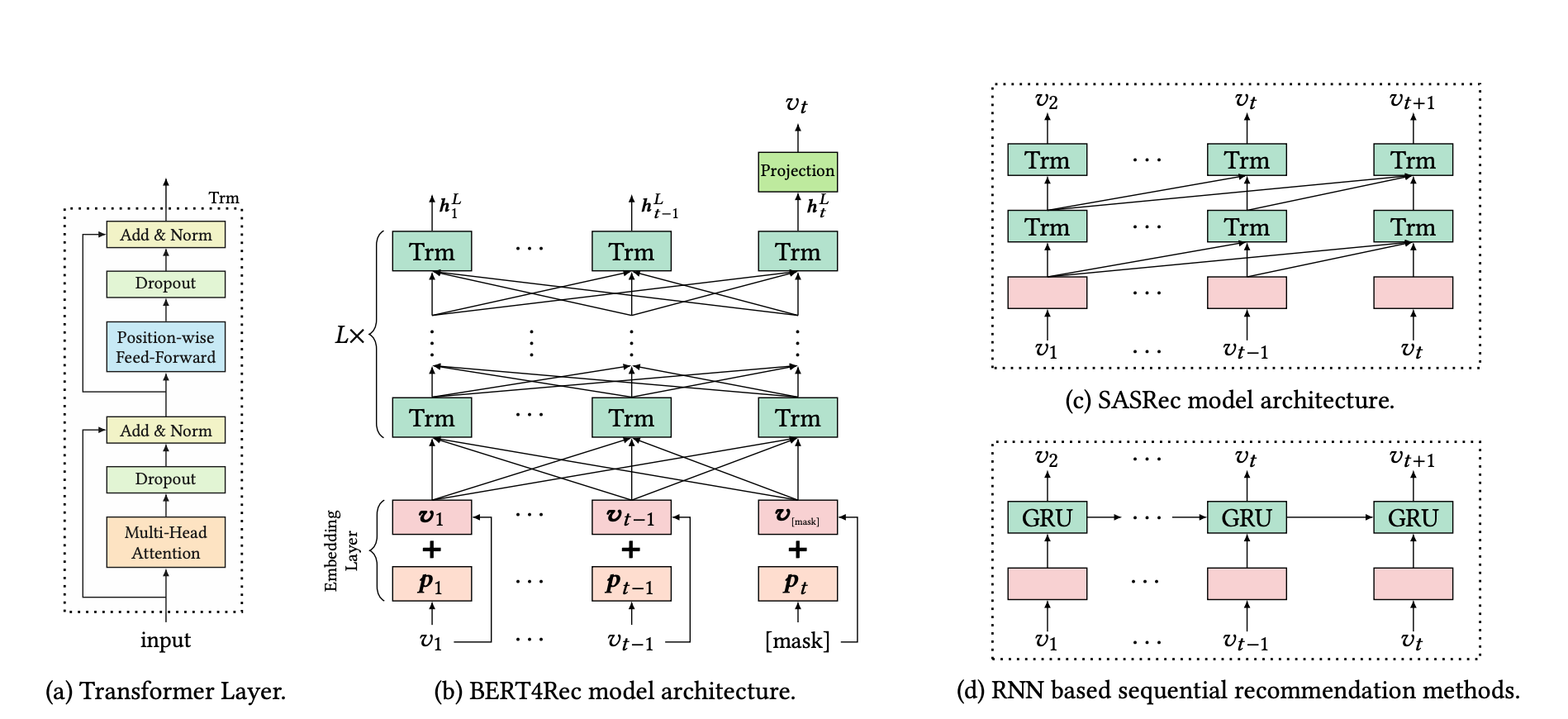 추천 모델 중 Sequential neural network는 가령 쇼핑몰 유저의 구매목록 등 sequential한 정보를 이용하여 그 다음 시점의 user interaction 에 대하여 예측하는 모델입니다. 기존의 GRURec, SASRec 등의 sequential 모델은 left to right로 unidirectional 한 방식으로 학습을 했지만, 논문에서는 Bidirectional Encoder를 사용하는 BERT를 이용하여 성능을 개선하였습니다.
