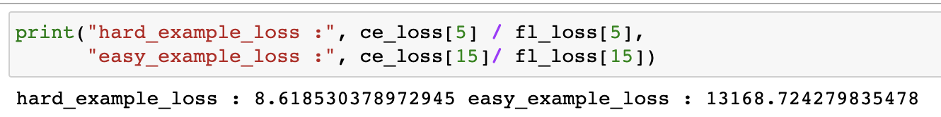 r=5로 조금 극단적인 예시를 들어 0.05~1.0 의 pt 일 때, low, high pt (0.3,0.8) 을 잡아 비교해봤더니 약 1500배정도 차이가 났습니다. 감마 값에 따라서 차이가 나겠지만, focal loss 는 negative easy example 에 집중한다고 볼 수 있습니다.
