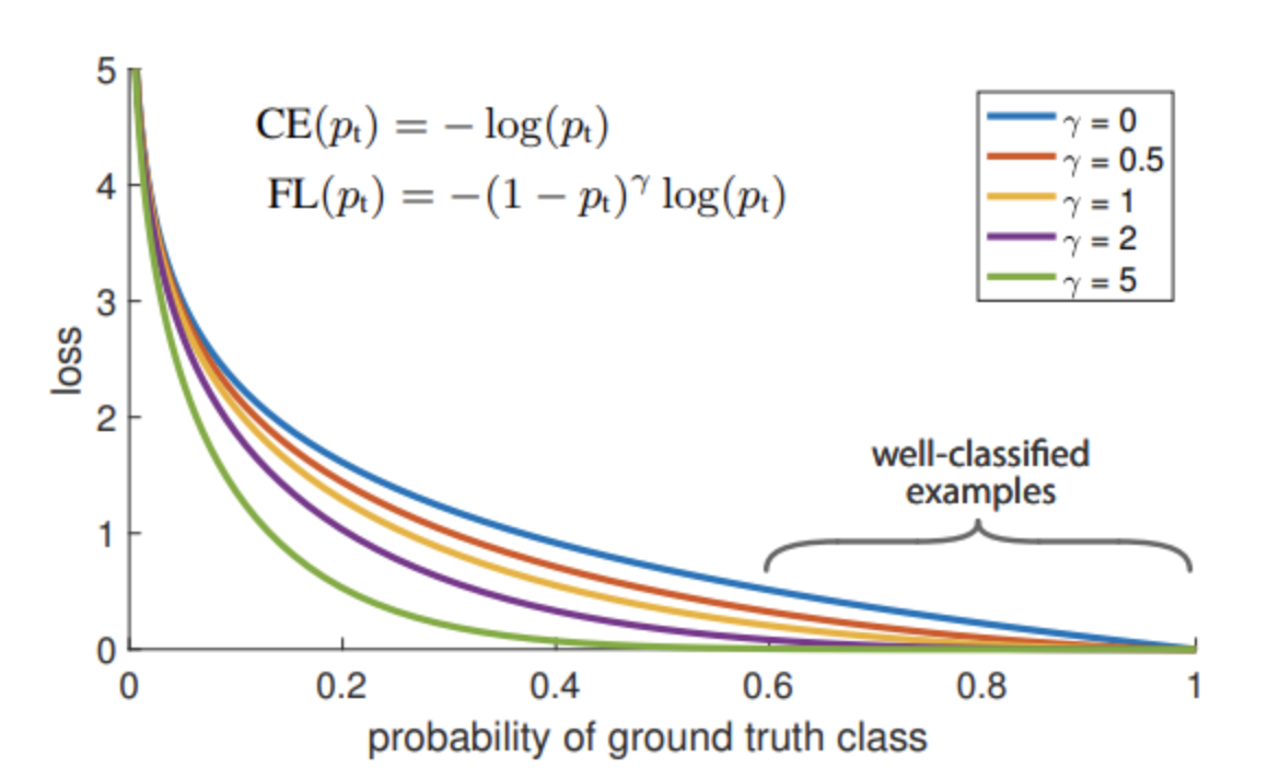 1. high pt: pt가 크고, well-classified examples 인 경우, modulating factor는 0에 가까워지고, focusing parameter인 ${\gamma}$ 값이 커질수록 loss 가 줄어듭니다. 즉, easy example에 대한 down-weight를 한다고 볼 수 있습니다.