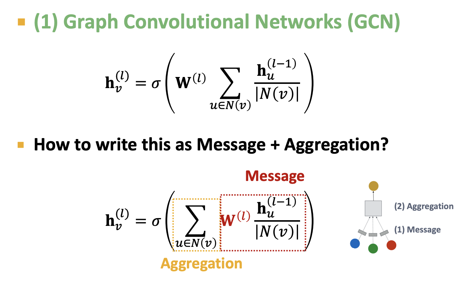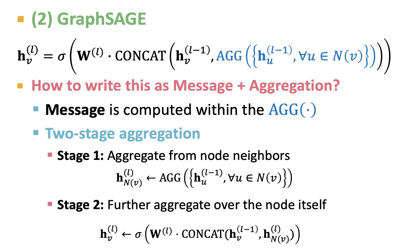 이제 message transformation 그리고 aggregation 의 operation 으로 GCN 과 GraphSAGE 를 살펴보자.