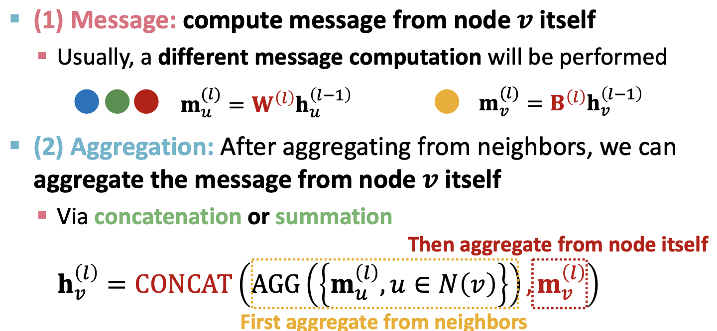 여기서 주의해야 할 점이 이대로 주변 노드들의 정보만 계속 업데이트 하다보면 노드 v 자신에 대한 정보가 update 되지 않는다는 거다. 이를 해결하기 위해 self-roop 를 만드는식으로 자기자신 노드의 정보를 다음 레이어에 보내는데, (1)message transformation 을 보면 이웃노드들은 linear transformation 후 Aggregate 함수를 거쳐서 $m^{(l)}_{u}$ 가 되고 , 노드 $h_{v}^{l-1}$ 는 다른 연산을 거쳐서 두 벡터를 concatenate 한다. 그 후엔 비선형함수인 ReLU 를 거쳐서 expressiveness 를 주면서 임베딩을 구한다.