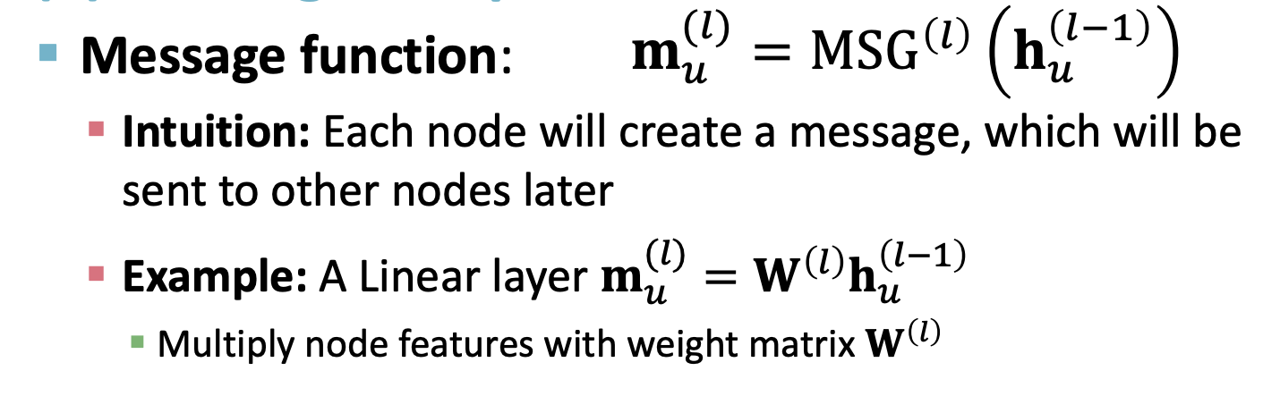 Message function 의 기본 컨셉은 이전 노드를 다음 레이어의 노드로 업데이트 시켜주는 것이다. 이전 레이어의 노드 u 의 임베딩이 weight matrix 와 곱해지는 형태는 linear transformation 으로 볼 수 있다.