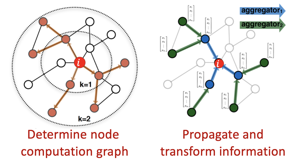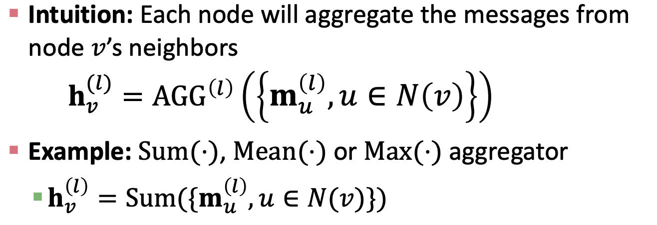 오른쪽 그림의 Aggregation 은 이웃 노드들로 부터 오는 정보를 어떻게 이용할 것이냐에 대한 것이다. Sum, Mean, Max 등..