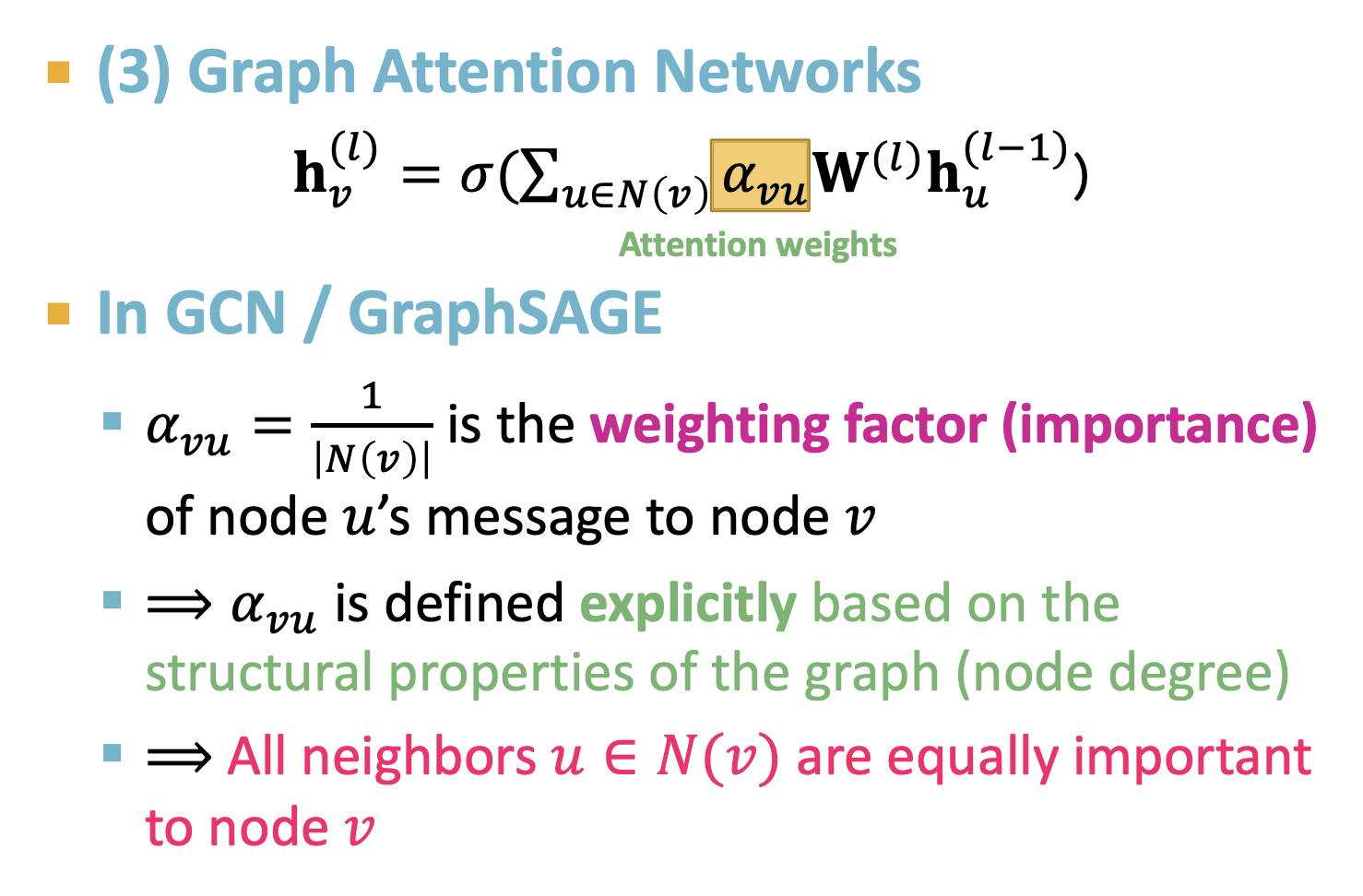 세 번째는 Graph Attention Network(GAT) 에 대해서 얘기한다. 아직 논문을 못 읽은 상태지만 별다를 건 없고 attention score를 이용해서 노드 weight 를 업데이트한다는 것 같다. $a_{vu}$는 노드v와 u의 attention weight고 각각의 노드끼리 스코어를 구하고 소프트맥스 함수로 산출하는 듯 하다.