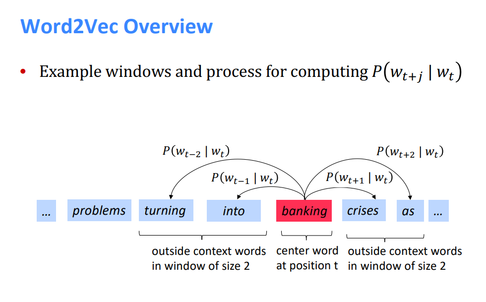 이제 단어들 간의 유사성을 설명하는 방법으로 그 유명한 Word2Vec이 나옵니다. 예시 그림에서 보면 알 수 있듯이 window size 2에서 중심 단어인 banking을 중심으로 앞뒤 2개의 단어가 있을 때의 중심단어의 조건부확률을 계산합니다.