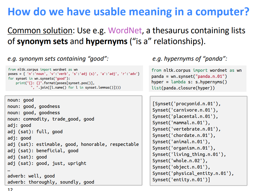 WordNet은 어떠한 단어에 대한 synonym sets(동의어)와 hypernyms(계층적 의미를 담고 있는 상위어?)를 제공하지만 그 단어에 대한 connotation이나 nuance를 담지 못하는 한계가 있습니다.