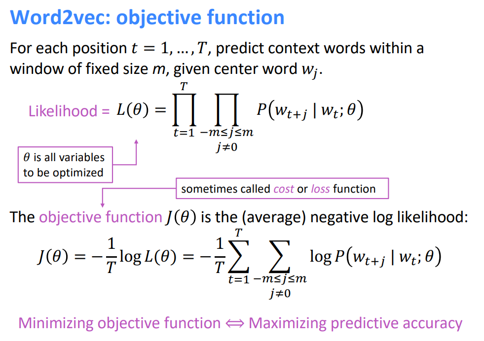 수식을 보면 1부터 T까지인 t는 단어의 인덱스를 의미하고 window size인 m내에서 Wt;세타의 확률을 계산하는 것을 알 수 있습니다. 이것을 기계학습에서 흔히 하는 - log함수의 목적 함수의 형태로 변환 할 수 있습니다. 마이너스를 붙여주는 건 최대확률을 구하는 확률식에서 loss의 최솟값을 구하는 함수식으로 바꿔주기 위해서입니다. 또한 corpus의 개수인 T로 나눠줌으로써 scale의 차이에 따른 영향을 감소시킵니다. log함수를 씌운 것은 곱셈합을 덧셈으로 바꿔주기 위함이고 나머지 식은 Likelihood를 구한 식과 별 차이가 없습니다. 세타 j를 줄여나가면서 가장 적합한 단어를 찾아나가게 됩니다.