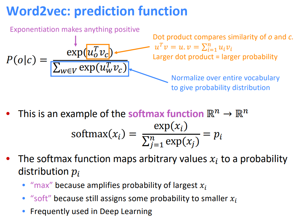 중간에 내용이해가 안되는 부분은 ratsgo님의 blog 의 word2vec포스팅을 참조하였습니다. 좌변의 c는 center word 로 중심단어가 주어졌을 때 주변단어인 o의 확률을 의미하고 우변은 이제 소프트맥스 함수의 형태로 오렌지 박스는 중심단어와 주변단어간의 유사성을 벡터내적으로 계산하는 부분입니다.