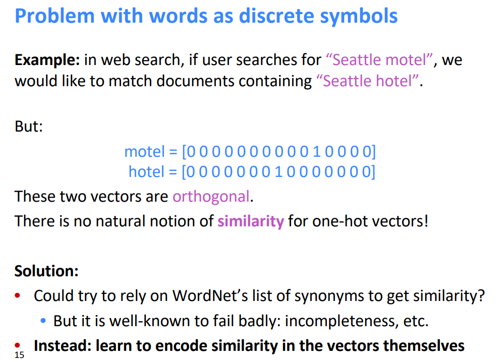 그래서 처음에 단어를 represent한 방법은 One-hot vector 였습니다. 예를들어 모텔은 [0000010000], 호텔은 [000100000] 이런식으로 해당 단어의 space에 1을 지정하는 방식으로 단어를 구분하는 것입니다. 여기서 발생하는 문제는 엄청나게 많은 단어, 또한 파생단어가 있을 텐데 정작 의미있는단어는 하나이다 보니 벡터가 엄청나게 커지게됩니다.